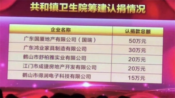 經(jīng)過陳院長的現(xiàn)場倡議,企業(yè)家們共商善舉,紛紛解囊。捐款全部用于共和衛(wèi)生院的建設(shè)及設(shè)備投入。其中,在鶴山市總商會(huì)的牽頭下,廣東鴻業(yè)家具集團(tuán)董事長王洪杰先生捐贈(zèng)人民幣30萬元。另外,自上個(gè)月工業(yè)城發(fā)出共和衛(wèi)生院綜合樓籌款倡議至晚會(huì)前,共和鎮(zhèn)商會(huì)會(huì)員企業(yè)紛紛慷慨解囊,已認(rèn)捐1400多萬善款。